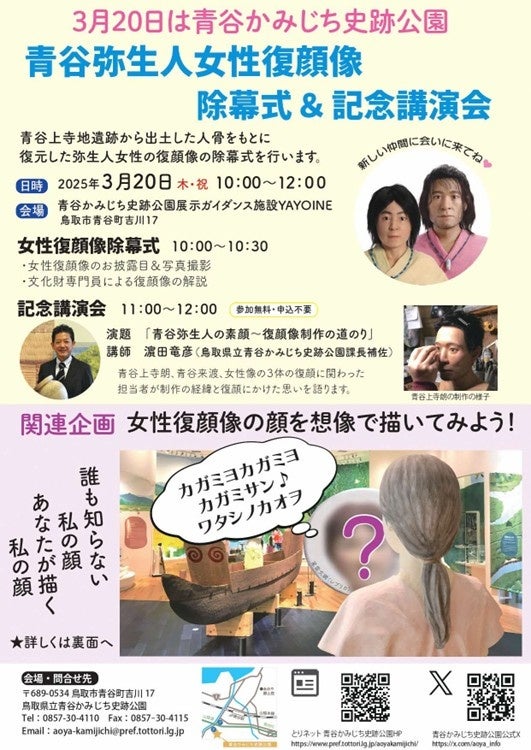 この度、2021年10月に最初の復顔がされて以来3人目となる、初の女性の復顔をすすめており、3月20日に「青谷かみじち史跡公園」でお披露目いたします。公開までの参加型企画として、女性復顔像の顔を想像で描いていただくイラスト応募企画も実施いたします。