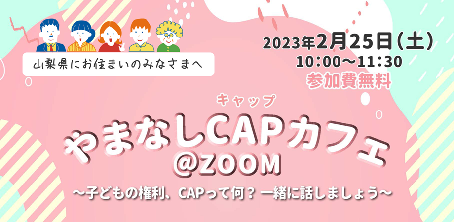 この度、このキャンペーンの一環として、Child Assault Prevention(子どもへの暴力防止)の頭文字をとり、子どもたちがいじめ、痴漢、誘拐、虐待、性暴力といったさまざまな暴力から自分を守るための人権教育プログラム「CAP(キャップ)」の考え方を活用し、子どもの権利を守り、虐待の予防につなげていくことを、皆さんと一緒に考えていただく機会として、「やまなしCAPカフェ@ZOOM」を開催しますので、お知らせします。