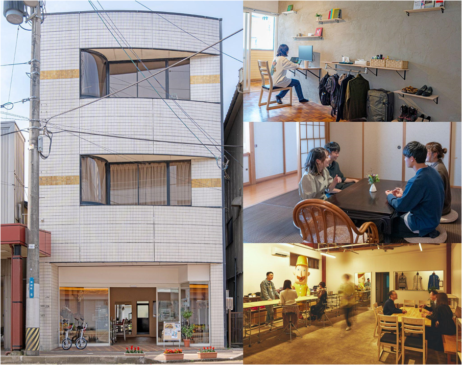 三-Me.は商店街の空き家を活用した複合交流拠点で、シェアテナント、お試し移住の宿、移住者(家守)の住宅を組み合わせた機能を持ち、市と連携を図りながら中心市街地の活性化や移住、空き家対策などの施策の取組を行っています。