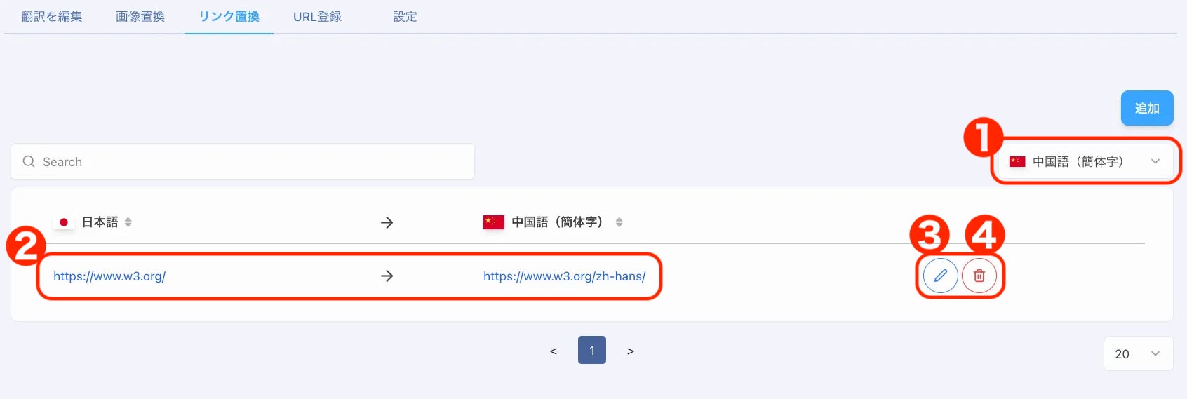 リンク置換テーブル右上の言語選択メニューから、翻訳したい言語を選びます。