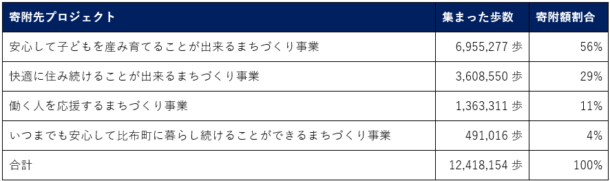 会社全体で合計12,418,154歩歩いて、歩数から算出した金額10万円の寄附が、北海道比布町に対して行われます。各プロジェクトへの寄附額は従業員の歩数によって決められます。