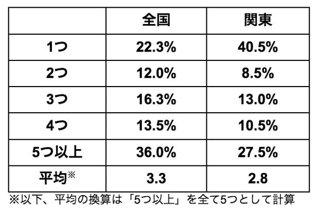 一方、関東で最も多かったのは「1つ」(40.5%)、2番目は「5つ以上」(27.5%)でした。