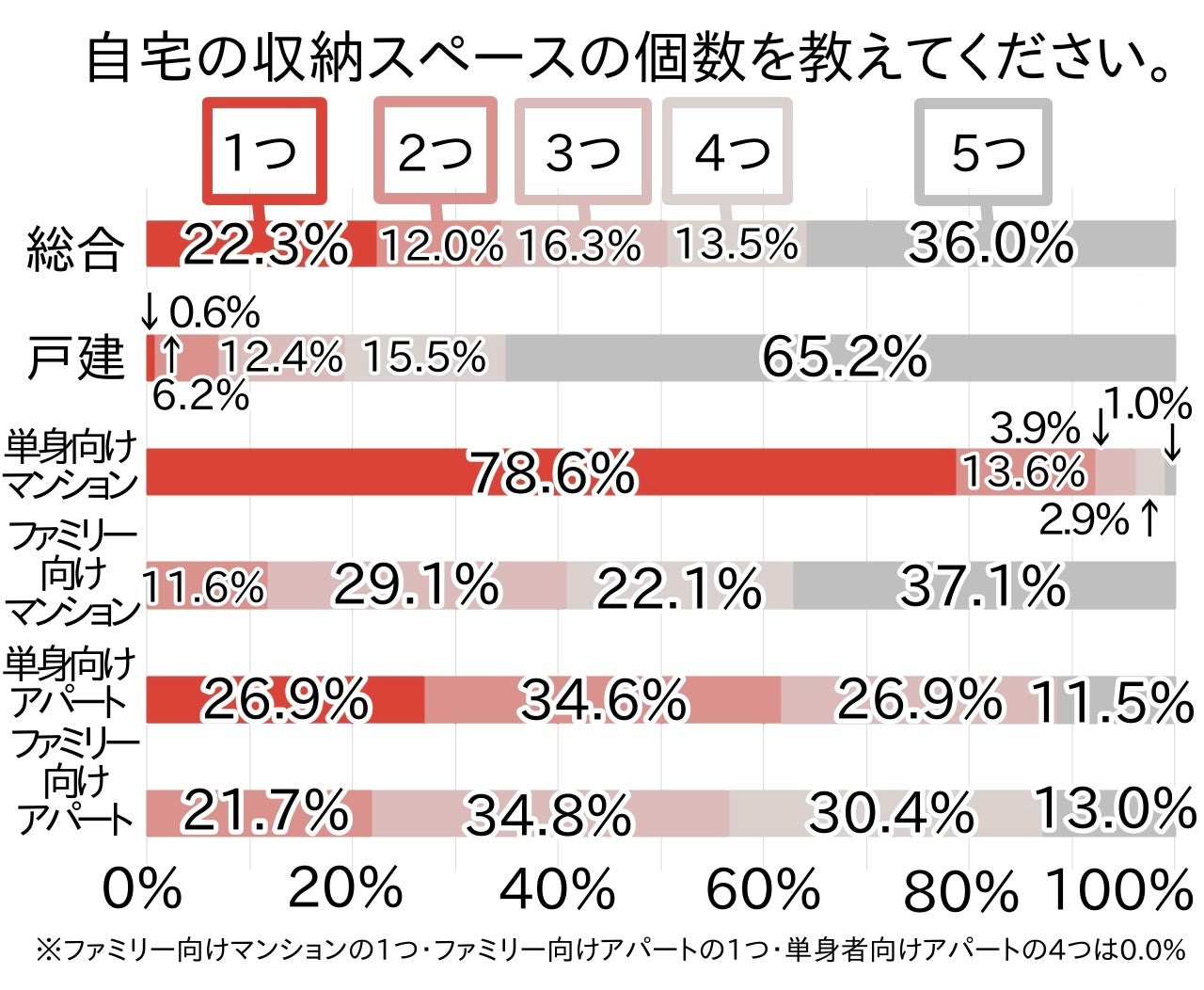 アパートに関しては関東のほうが収納スペースの個数が多く、その差は単身者向けアパートで全国比+0.4、ファミリー向けアパートで全国比+0.7でした。