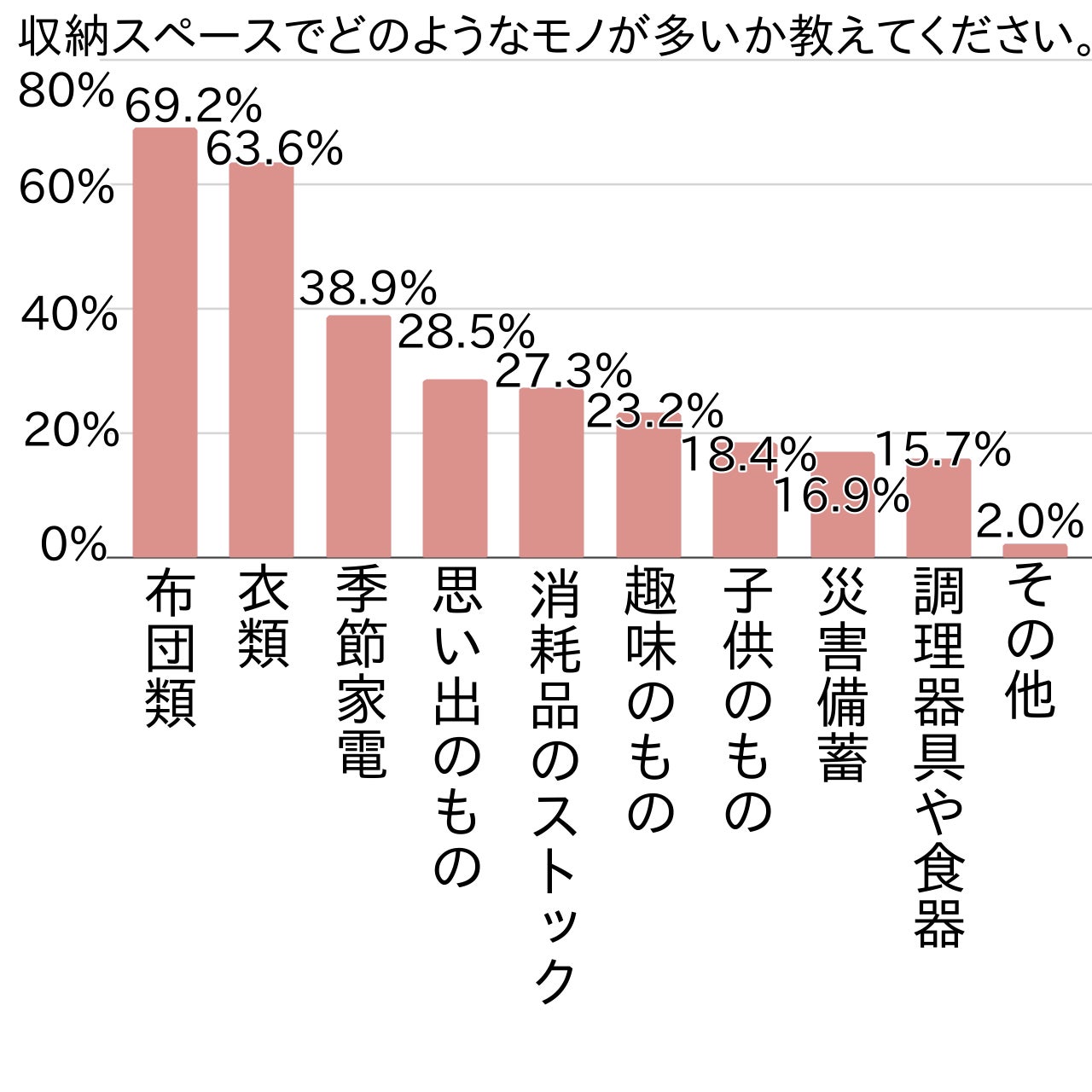 「布団類(第1位・69.2%)」と「衣類(第2位・63.6%)」に続き、「季節家電(第3位・38.9%)」・「思い出のもの(第4位・28.5%)」・「消耗品のストック(第5位・27.3%)」・「災害備蓄(第8位・16.9%)」が並びました。収納スペースでは普段使用しないモノが大きく場所をとっているようです。