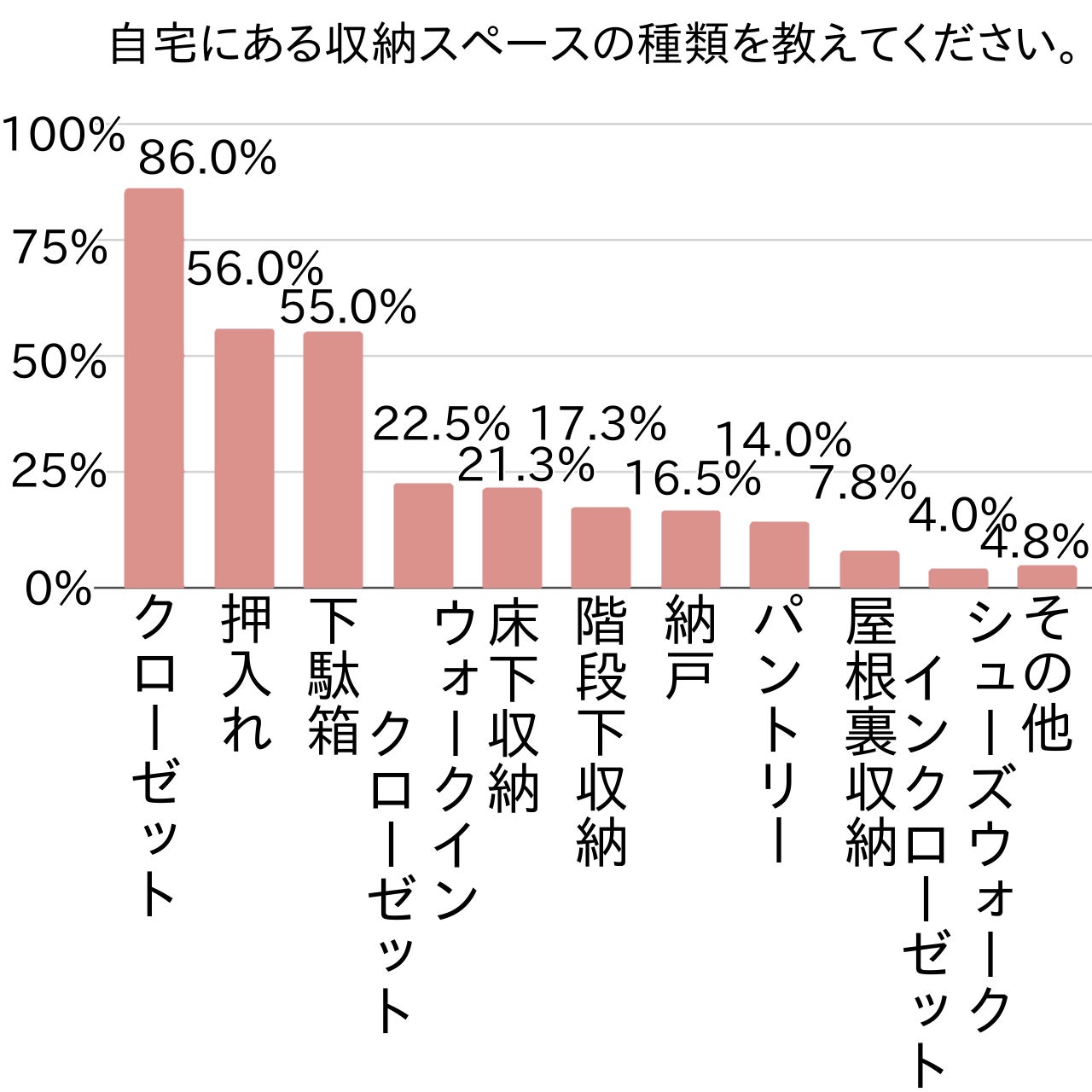 「クローゼット」(86.0%)・「押入れ」(56.0%)・「下駄箱」(55.0%)が半数を超え、第1位の「クローゼット」が約9割で突出していました。