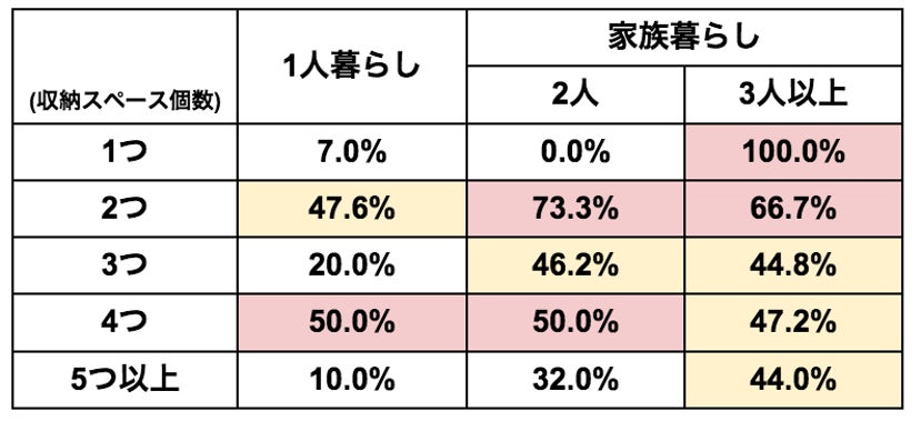 自宅の収納スペースの個数および居住人数別に収納スペース不足を感じている方の割合を集計し、収納スペース不足を半数以上が感じている箇所を赤、4割以上が感じている箇所を黄色にしました。