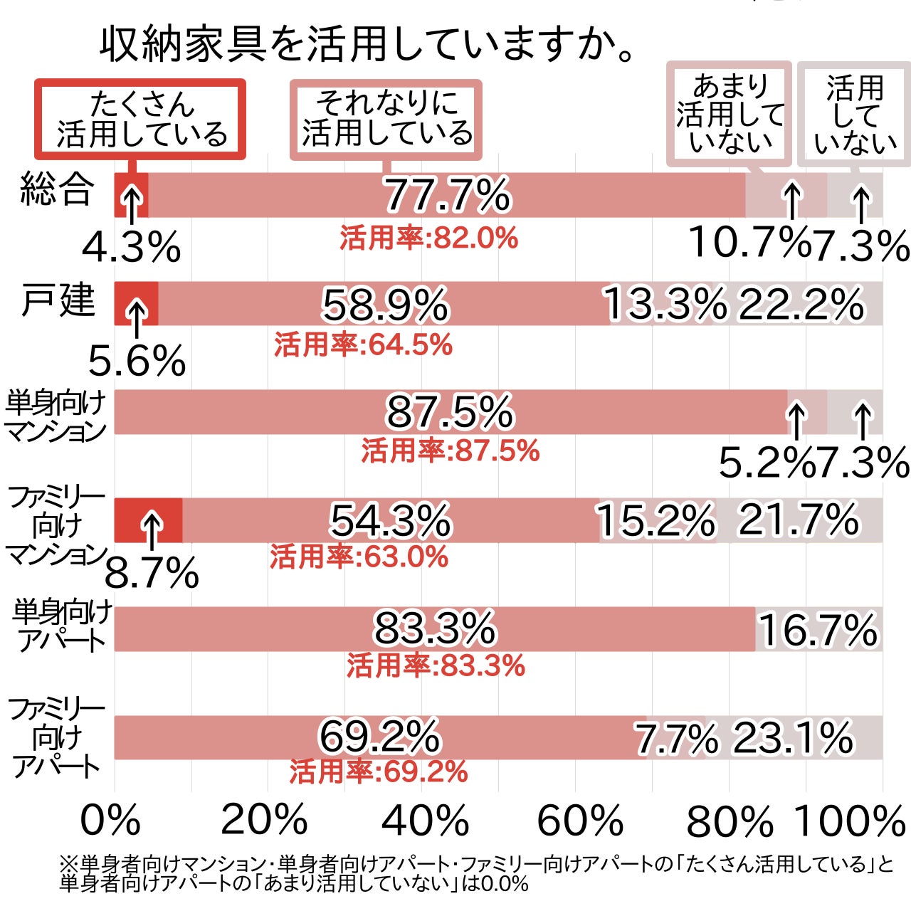 また、全ての住宅タイプで活用率は6割を超え、特に単身者向けマンション(87.5%)・単身者向けアパート(83.3%)で高い割合でした。