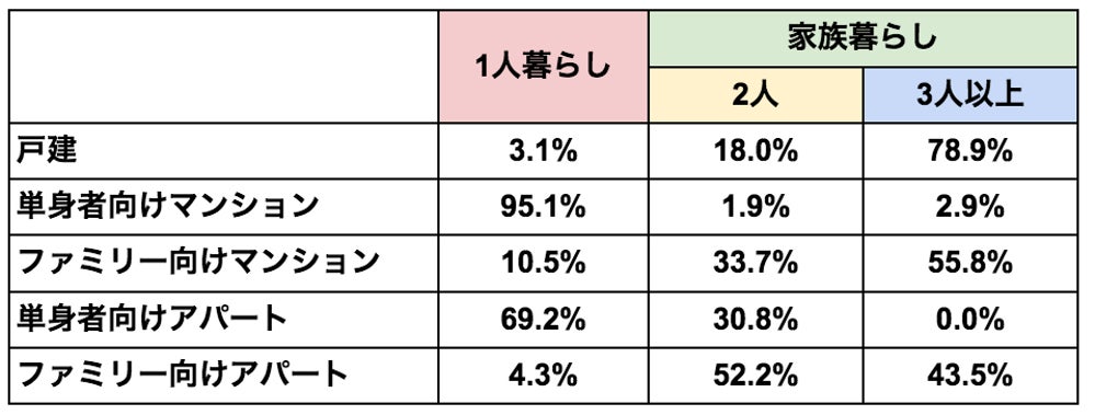 主に単身者向けのマンション・アパートには1人暮らしが多く、戸建・ファミリー向けのマンション・アパートには家族暮らしをする方が多いものの、戸建・ファミリー向けのマンション・アパートに1人暮らしをしている場合や、単身者向けのマンション・アパートに家族暮らしをしている場合もあることがわかりました。