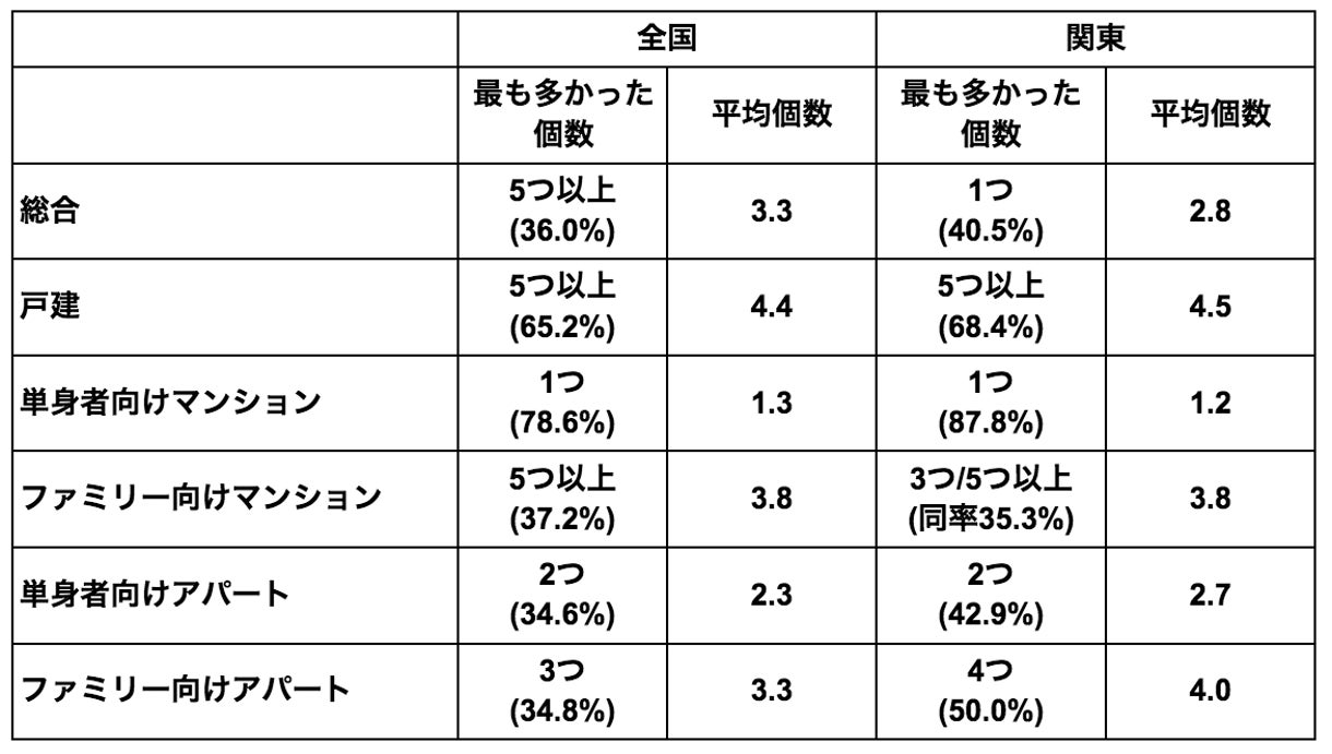 住宅タイプごとの全国/関東の差は僅か・個数は全国が多め