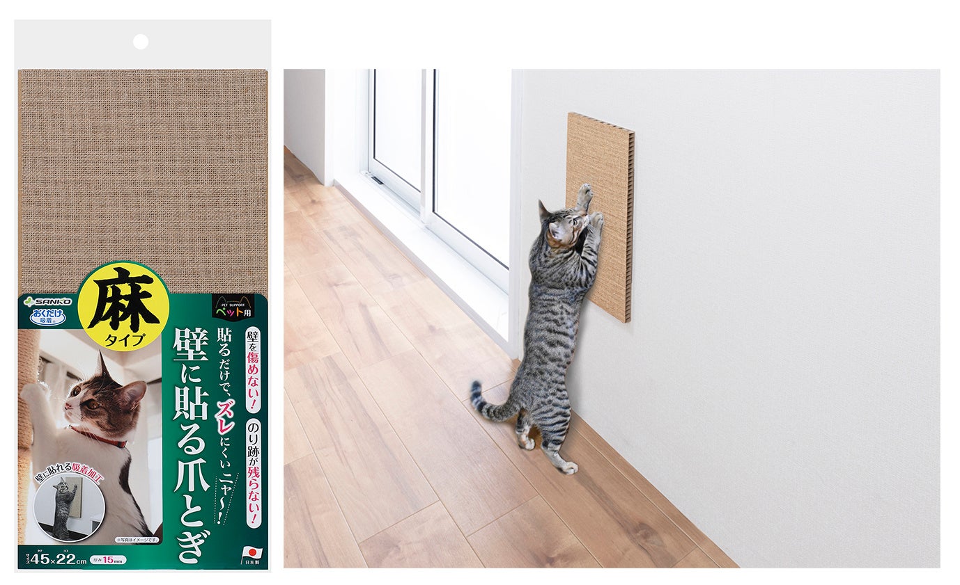 ねこちゃんの好きな高さの壁に貼れるつめとぎです。床から浮かせて設置できるので、掃除機掛けもラクラク!