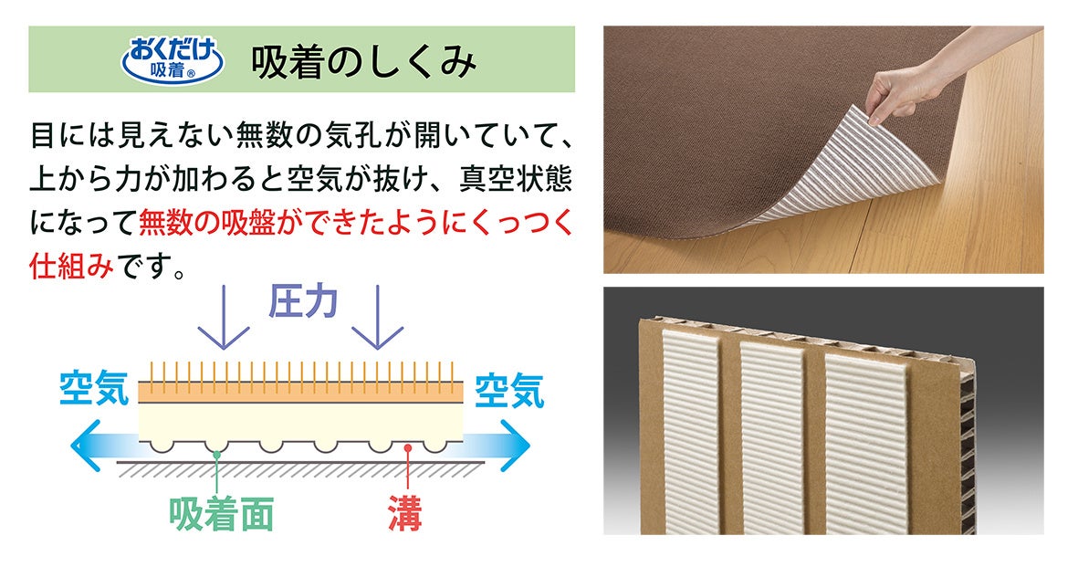 裏面に「おくだけ吸着Ⓡ」という独自の加工を施した商品で、マットやつめとぎ、ベンザシートなどに使用しており、床や壁にピタッと吸着してズレません。