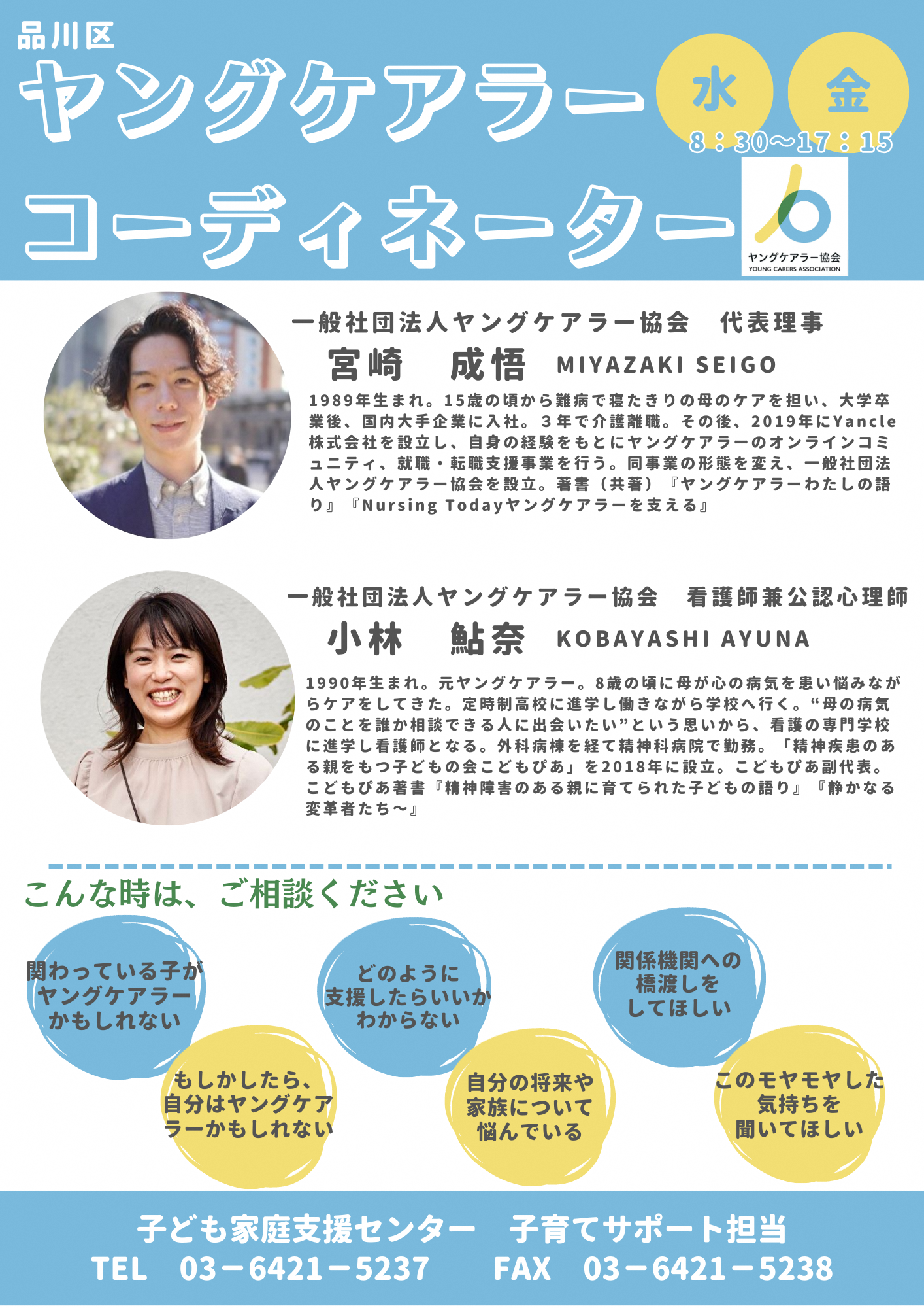 今年度、区は4月より一般社団法人ヤングケアラー協会(代表理事 宮崎成悟)へヤングケアラーに関する支援業務を委託し、全国でもめずらしい元ヤングケアラーのコーディネーターを子ども家庭支援センターに2名配置しています。「もしかしたら、ヤングケアラーかもしれない」「自分の将来や家族について悩んでいる」といった相談や、「どのように支援したらいいかわからない」「他機関への橋渡しをしてほしい」といった関係機関からの相談に宮崎氏と小林氏がコーディネーターとして対応します。
