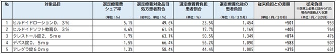 上位5品目における患者負担としては3か月で375円~874円と幅がありますが、いずれも従来の負担額から換算すると1.5倍以上と大きな変化が見られました。
