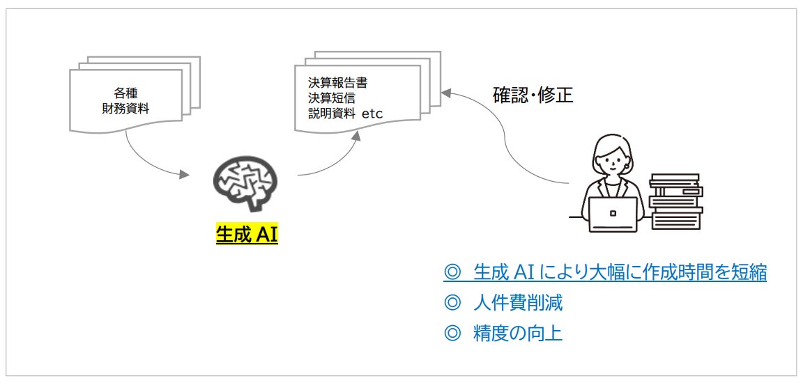 当研究では、「文書化」の業務を対象に、決算報告書・決算短信、説明資料などを自動で作成する生成AIを開発します。これにより担当者の作成時間を大幅に短縮するとともに、企業の決算報告を早めることが可能です。