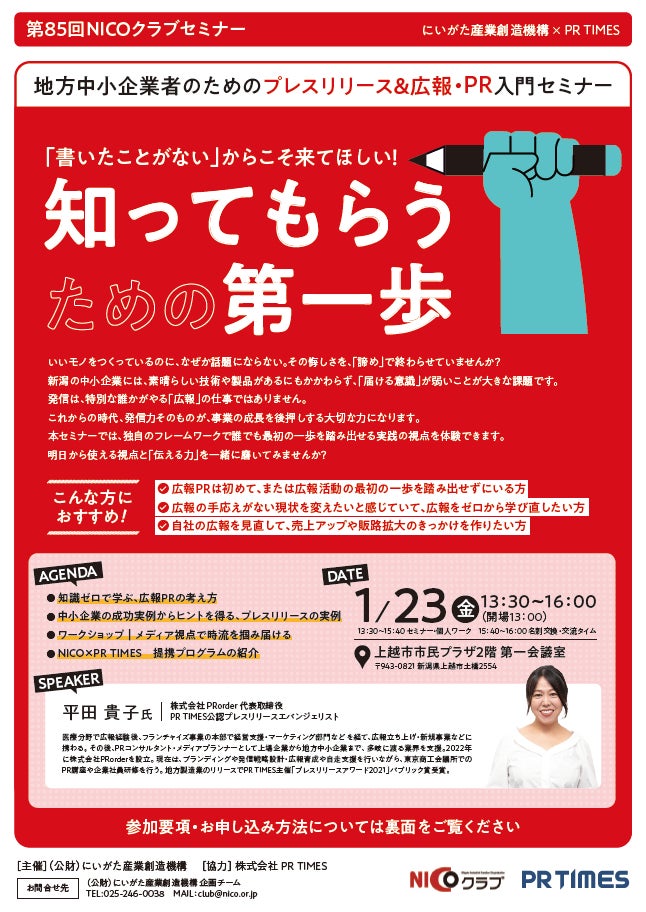 今回は、株式会社PR TIMES公認プレスリリースエバンジェリスト・株式会社Prorder代表取締役 平田 貴子氏による、地方中小企業者のためのプレスリリース&広報・PR入門セミナーを上越市内で開催します。