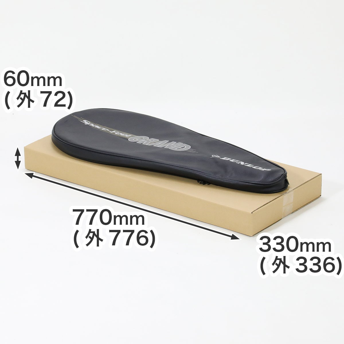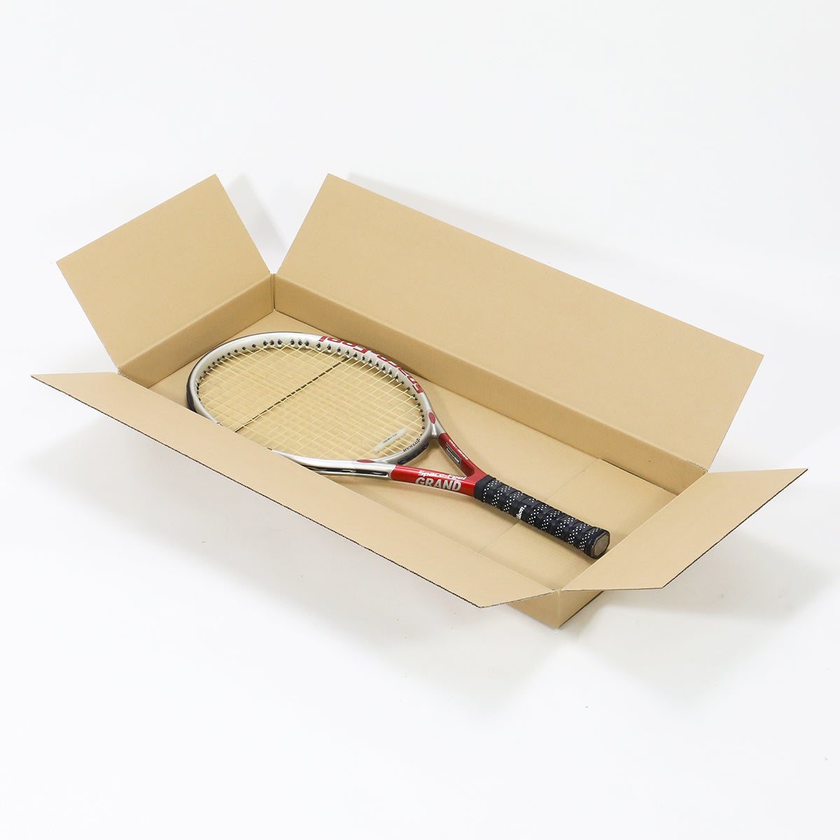 テニスラケットをケースに入れたまま梱包・発送できるサイズで設計したダンボール箱。スポーツ用品を取り扱うネットショップ様をはじめ、フリマアプリでの商品発送用の梱包資材としてもおすすめです。
