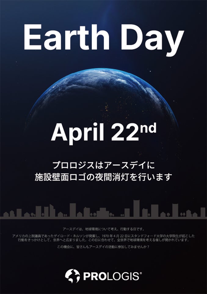 物流不動産の所有・運営・開発のリーディング・グローバル企業であるプロロジス(日本本社:東京都千代田区丸の内、代表取締役会長 兼CEO:山田 御酒)は、地球の環境問題について考える記念日「アースデイ」に賛同し、4月22日の夜間、全国で運営中の賃貸用物流施設「プロロジスパーク」の夜間消灯を行います。
