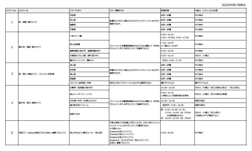 この度、7月から9月まで開催される岡山デスティネーションキャンペーンに合わせ、岡山・備後の駅や観光地を舞台に、JR 西日本が提供する移動生活ナビアプリ「WESTER」とせとうち観光ナビ「setowa」、およびギックスが提供する個客選択型スタンプラリー「マイグル」を活用したデジタルスタンプラリーを実施いたします。
