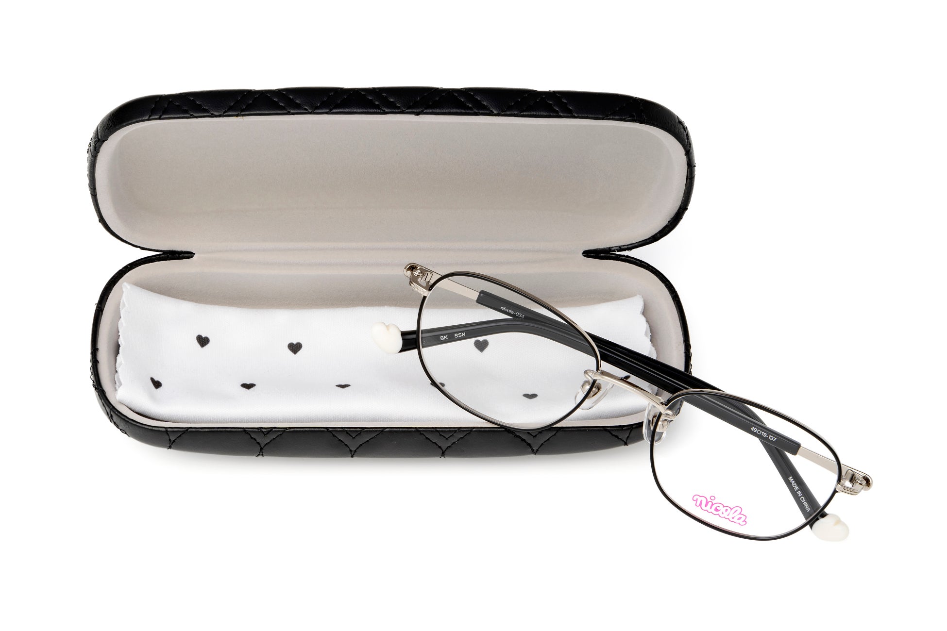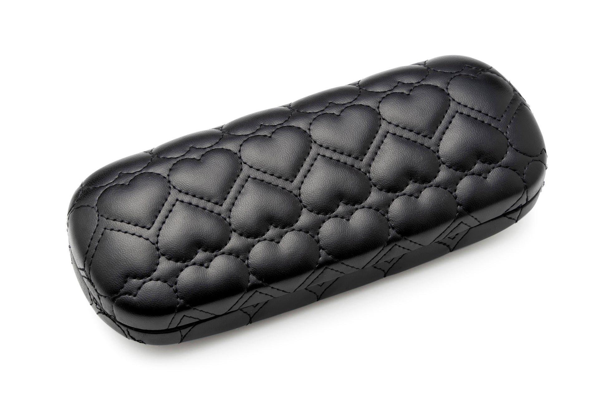 購入いただいた方限定でモノトーンカラーのメガネケース&メガネ拭きをプレゼント。ケースにハート型のキルティングを施した大人可愛いデザインです。
