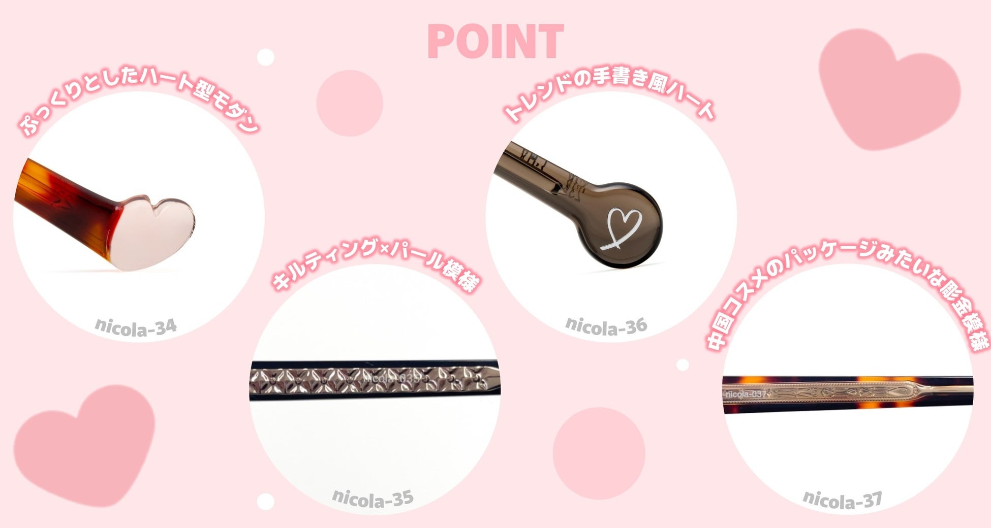 今年の新作もニコラ専属モデルと打ち合わせを重ね完成した、制服にも合わせられるようにシンプルなフロントデザインの大人かわいいフレーム。アクセントとして、モダンやヨロイにはぷっくりハートや手書き風ハートを取り入れました。またテンプル芯には、キルティングや中国コスメのパッケージをイメージした彫金模様を施すことで掛けていない時もかわいいを楽しめるデザインです。