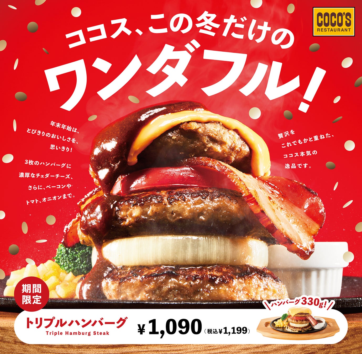 株式会社ココスジャパン(代表取締役社長:一木 直哉 本社:東京都港区)が全国に展開するファミリーレストラン「ココス」では、12月1日(木)から、総量330gの合い挽きハンバーグで、オニオン・トマト・ベーコンを挟み、トップにチェダーチーズをのせた、食べる前からワクワクする7層のハンバーグ「トリプルハンバーグ1,090円(税込1,199円)」を販売します。子どもから大人まで愛されるハンバーグを、年末年始の特別な季節に合わせて、この冬だけのワンダフルな商品をご提供します。