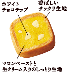 ・マロンペーストと生クリーム入りのしっとり生地にホワイトチョコチップを練り込み、香ばしいサックリ生地と合わせ焼き上げた、彩り豊かなプチタルトをイメージしたクッキー