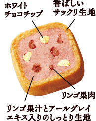 ・リンゴ果汁とアールグレイエキス入りのしっとり生地に、リンゴ果肉とホワイトチョコチップを練り込み、香ばしいサックリ生地と合わせ焼き上げた、彩りあざやかなプチタルトをイメージしたクッキー