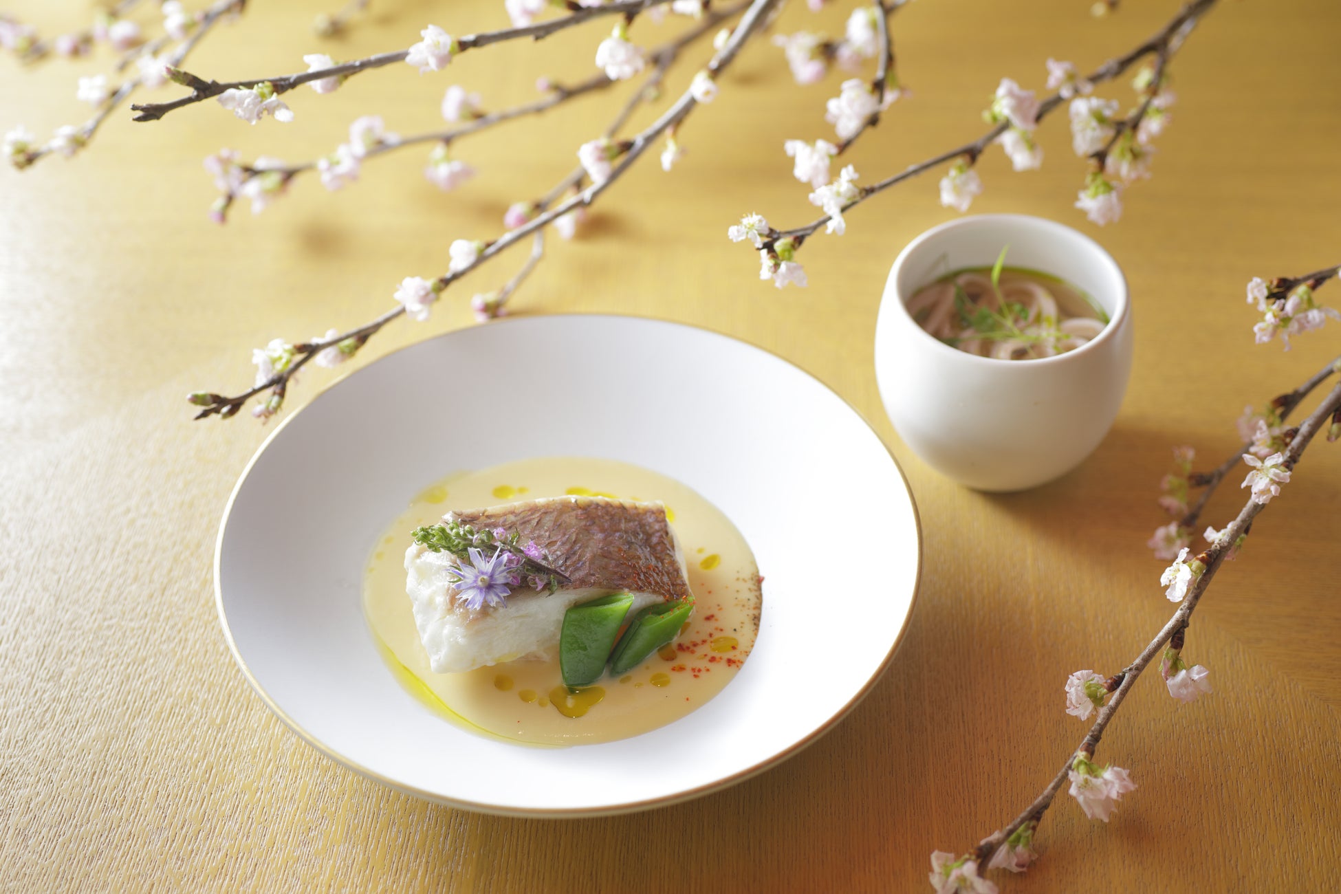 春を祝う桜鯛。ふっくらと蒸しあげた滋味を、京都山利の白味噌が優雅に纏わせます。心解ける至福の口福を。