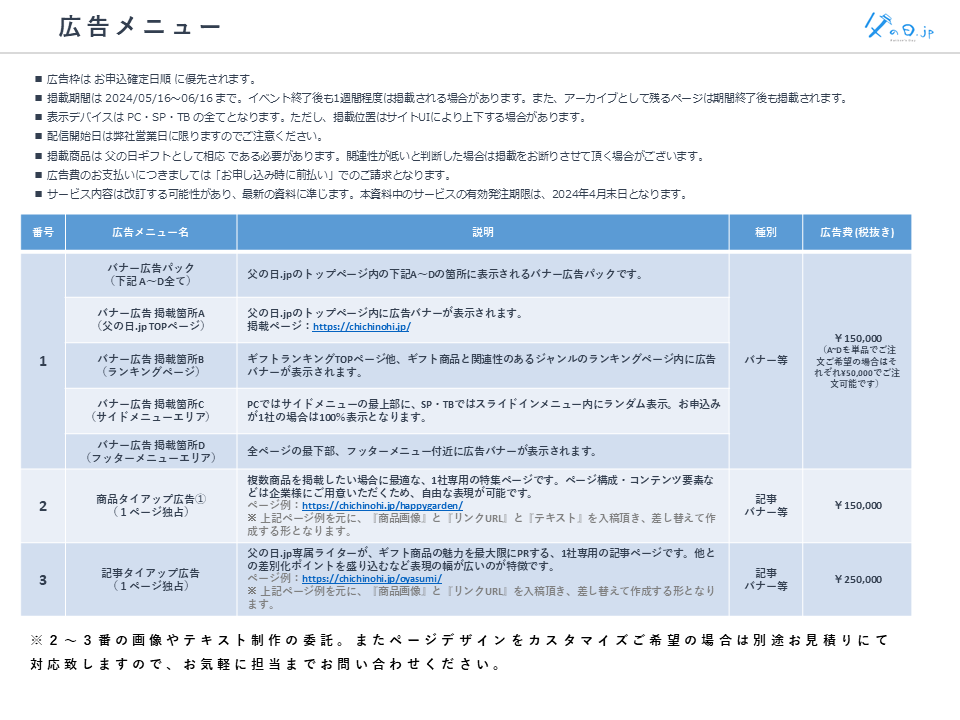 2025年度の父の日.jpの広告募集スケジュールは、2025年4月末日〆切となります。