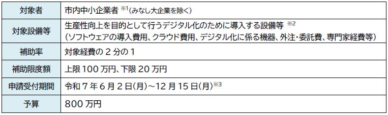 昨年度に引き続き、市内中小企業者の皆様がDX・デジタル化のために導入する設備に対して補助を行います。