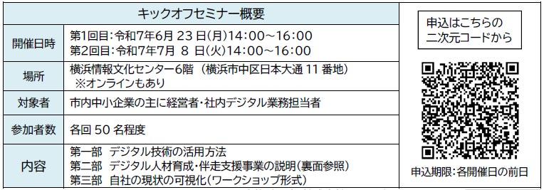 DXに取り組むうえで課題となる「知識や情報の不足」「統括を担う人材の不足」の解消に向け、講座を開催します。詳細はキックオフセミナーでご案内します。