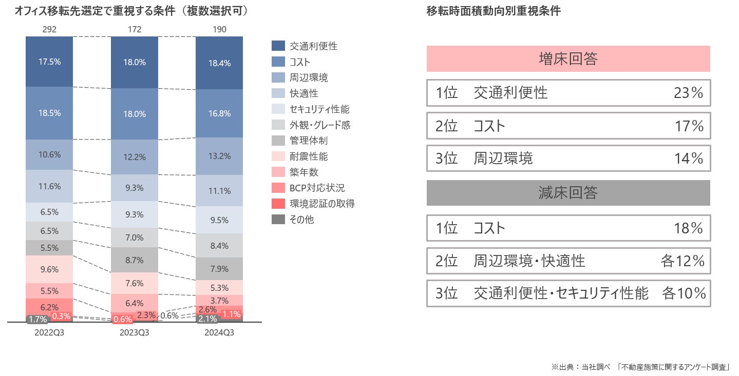 当社にて実施した「不動産施策に関するアンケート調査(24-Q3)」によると、オフィス移転先を選定する際に重視する条件は、 「交通利便性」が最も多く、「コスト」、「周辺環境」が続いた。交通利便性の回答割合は上昇傾向となっており、オフィス選定時に交通利便性を重視する傾向が強まっている。一方で、引き続き「コスト」の占める割合は高いものの、本調査を開始した2022年Q3以降、回答割合は低下傾向となっている。また、オフィス移転時の面積動向別に見ると、減床移転においては「交通利便性」よりも、「コスト」を重視する傾向が見受けられた。