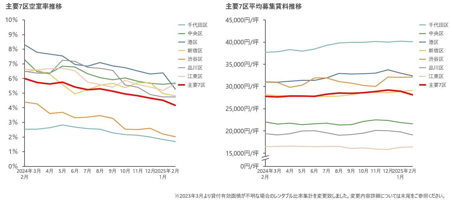 三菱地所リアルエステートサービス株式会社(本社:東京都千代田区大手町1-9-2、代表取締役社⾧:湯浅哲生)は、2025年2月末時点の東京主要7区(千代田区、中央区、港区、新宿区、渋谷区、品川区、江東区)の大規模オフィスビル※1の空室率・平均募集賃料調査を実施し、この度、調査結果がまとまりましたので、お知らせします。