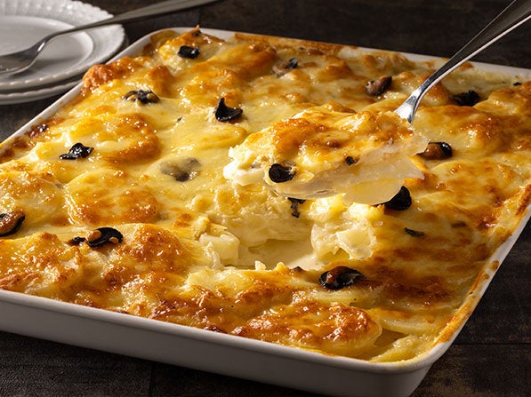 刻んだ黒トリュフをクリーミーなポテトグラタンのソースに混ぜ込み、香り高く焼き上げました。