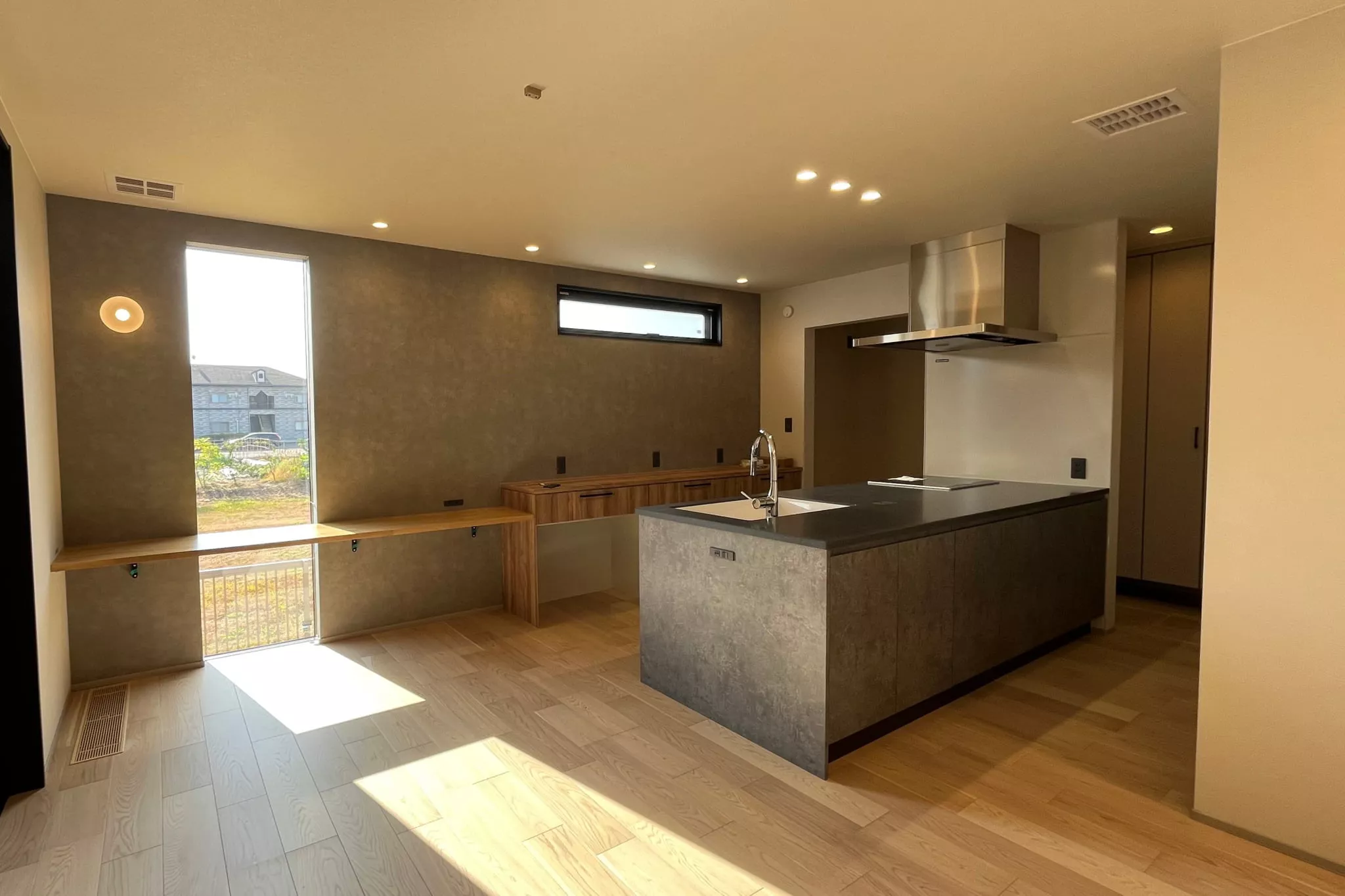ガラス玄関ドアとLDKの窓を直線に配置し、視線がまっすぐ外まで抜けるよう計画。実際の面積以上に広く感じる間取りとなった。
