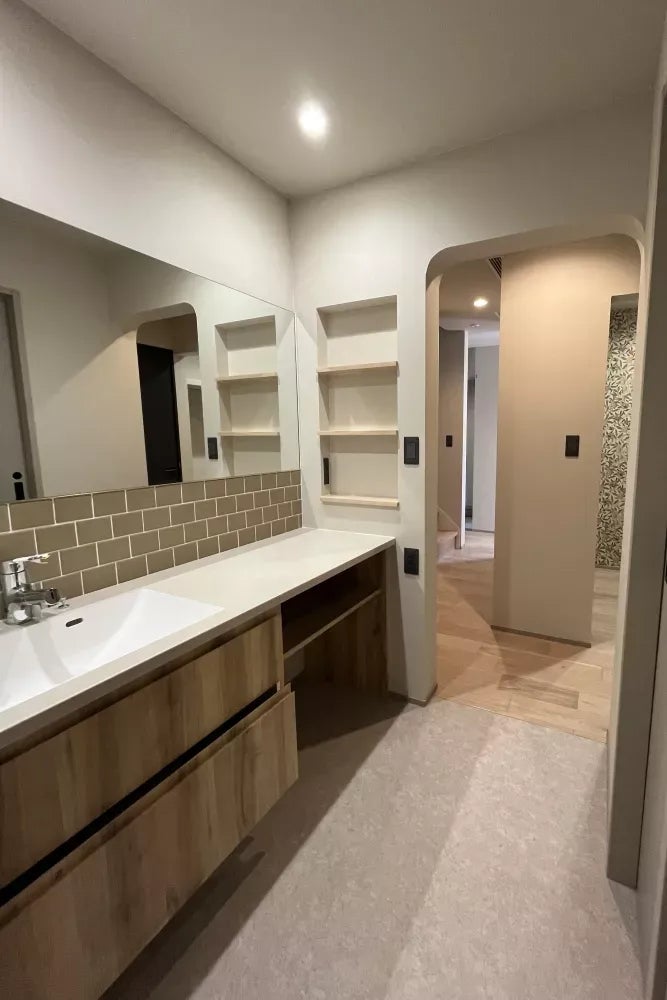 木や塗り壁といった自然素材の温もりが息づく「ジャパンディ」スタイル。ベージュやグレージュを基調としたニュアンスカラーで統一し、都会的な洗練さと心安らぐ和の情緒を両立させた。