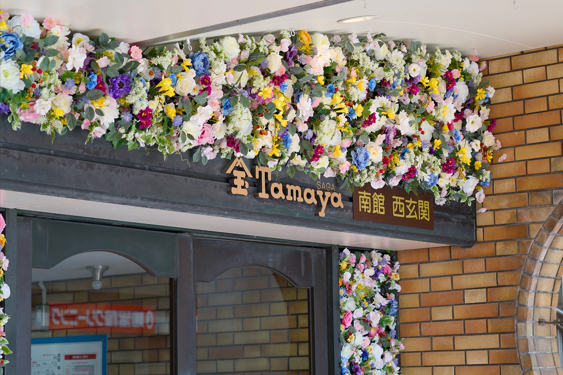 西玄関の装花は、220周年ロゴをモチーフにしたデザインへとリニューアルし、来館時から佐賀玉屋ならではの世界観を体感いただける空間へと進化しました。