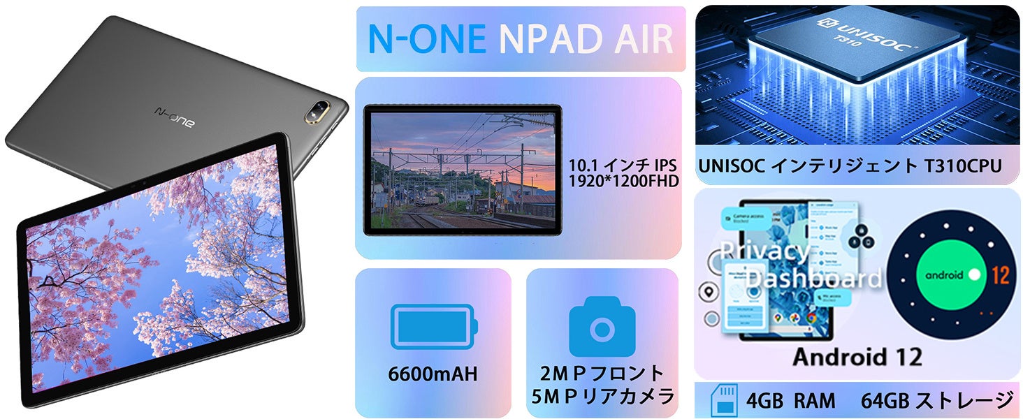 N-one NPad Air タブレット、1920*1200超高解像度 HD IPSディスプレイ、T310 CPU最大2.0GHz、1TB TF拡張可能+4GB RAM+64GB ROM、GMS認証+6600mAh大容量バッテリー+Type C充電+2.4G/5G Wi-Fi対応、4G LTE SIM通話 タブレット10.1インチ、Bluetooth5.0+GPS+2MP/5MPカメラ、日本語取扱説明書付き