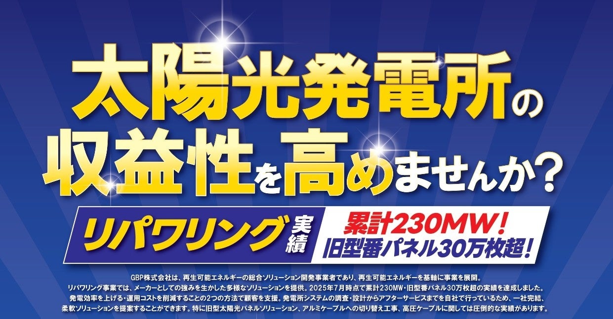 再生可能エネルギー、EV自動車部品、AI及びIoT領域における先進技術を駆使し、グローバルに急速に成長している、~再エネ業界の風雲児~ GBP株式会社(本社:東京、以下GBP)は、2025年11月19日(水)から21日(金)の3日間、 インテックス大阪で開催される第5回 脱炭素経営 EXPO【関西】に出展いたします。本展示会では、「トップランナー第二次判断基準・第三次判断基準」対応変圧器、移動式太陽光発電所、リパワリングをはじめ、確かな実績を備えたGBPの製品及びサービスをご紹介します。