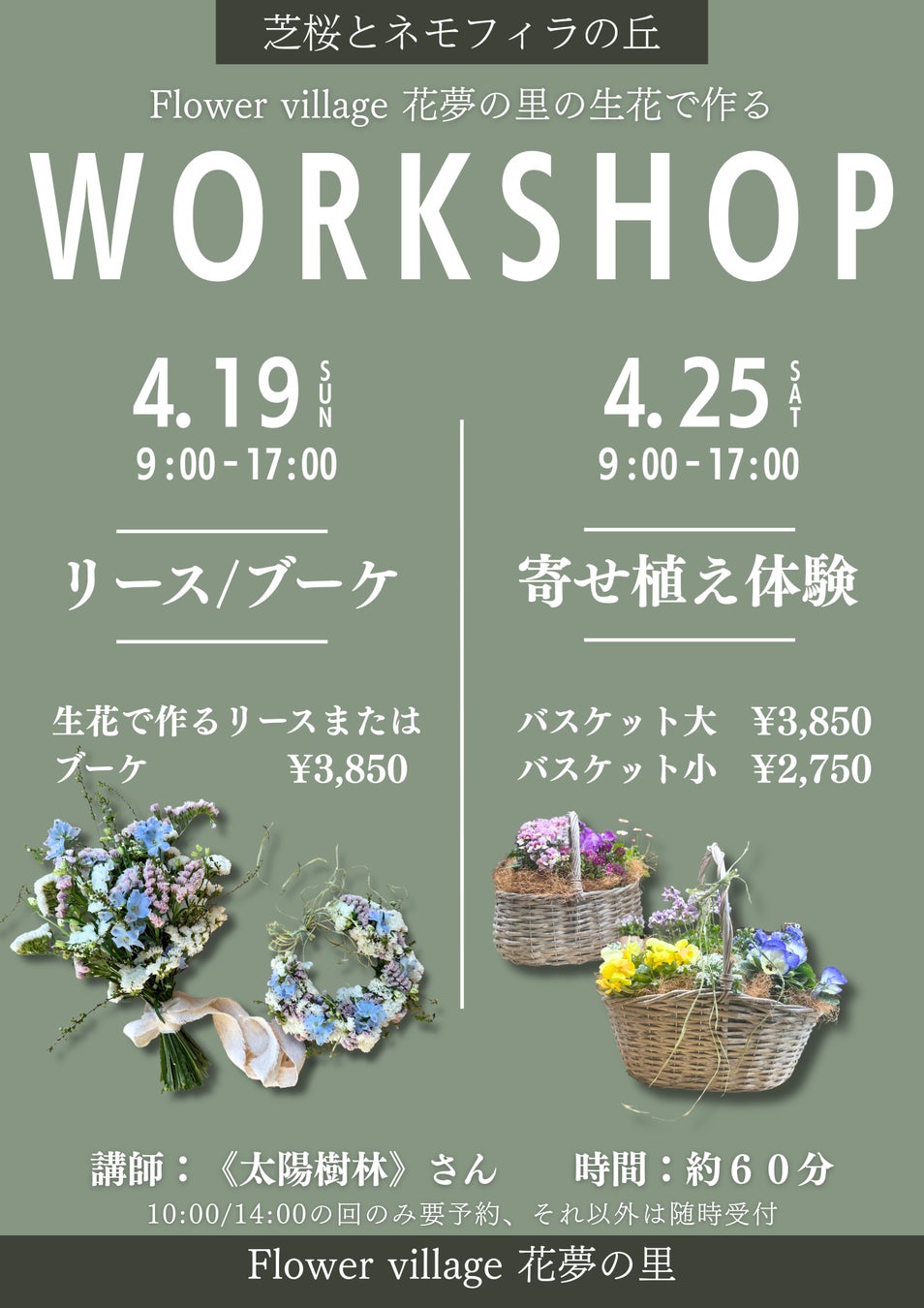 広島市安芸区「太陽樹林」さんによるワークショップを開催します。Flower village 花夢の里生花を使って作ります。