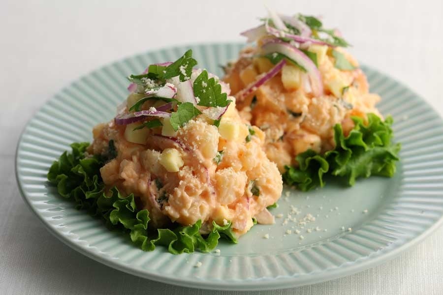 明太子ポテトサラダにクリームチーズ、角切りにしたプロセスチーズ、パルメザンチーズを合わせた濃厚なポテトサラダです。明太子のピリリとした辛味とチーズがよく合います。また、爽やかな大葉の風味がアクセントになっています。