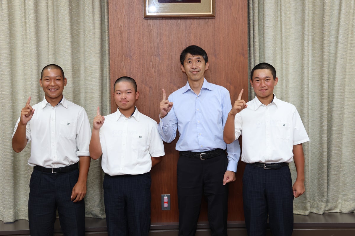 この日、部員3名と教員2名が訪れ、8月6日から行われる第72回近畿中学校総合体育大会への出場に向けて、部長の植田崇志さんは「大阪大会より厳しい戦いになると思うので五領らしさを大事にして粘り強く戦っていきたいです」と意気込みを話し、八十副市長は「練習の成果を思う存分発揮してください」と激励しました。