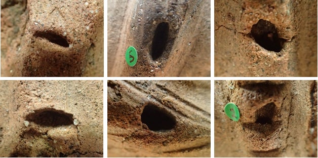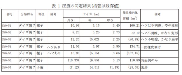 SMO-51の凹みは長さ10.9㎜、幅5.2㎜、厚さ3.4㎜で、下方は器面に対してオーバーハングし、ヘソの形状は不明瞭でした。SMO-52は長さ8.2㎜、幅5.3㎜、厚さ2.7㎜で、ダイズ属?は下から上に向かってスライドするように押し込まれているため、上方にオーバーハングしている箇所が認められました。また、圧痕底面は平坦で、臍の形状は不明瞭でした。SMO-53は長さ12.2㎜、残存幅5.6㎜、厚さ2.2㎜でした。ダイズ属の形状を良好に留めていますが、臍の形状は不明瞭です。SMO-54は長さ11.1㎜、幅6.0㎜、厚さ3.9㎜でした。種子は斜め右下に向かって押し込まれており、圧痕右側面および下方にオーバーハングしている箇所がありました。右側面には長楕円形の臍が認められます。SMO-55は長さ10.9㎜、残存幅5.2㎜、厚さ3.7㎜で、圧痕底面に長楕円形の臍およびその中央にダイズ属の特徴である縦溝が確認できました。SMO-56は残存長10.3㎜、残存幅6.6㎜、厚さ3.1㎜で、種子の側面が押し込まれ、臍の形状は確認できませんでした。SMO-57は残存長7.1㎜、残存幅4.5㎜、残存厚1.5㎜ですが、変形が著しく、マメの形状が判然としませんでした(小林ほか2022)。