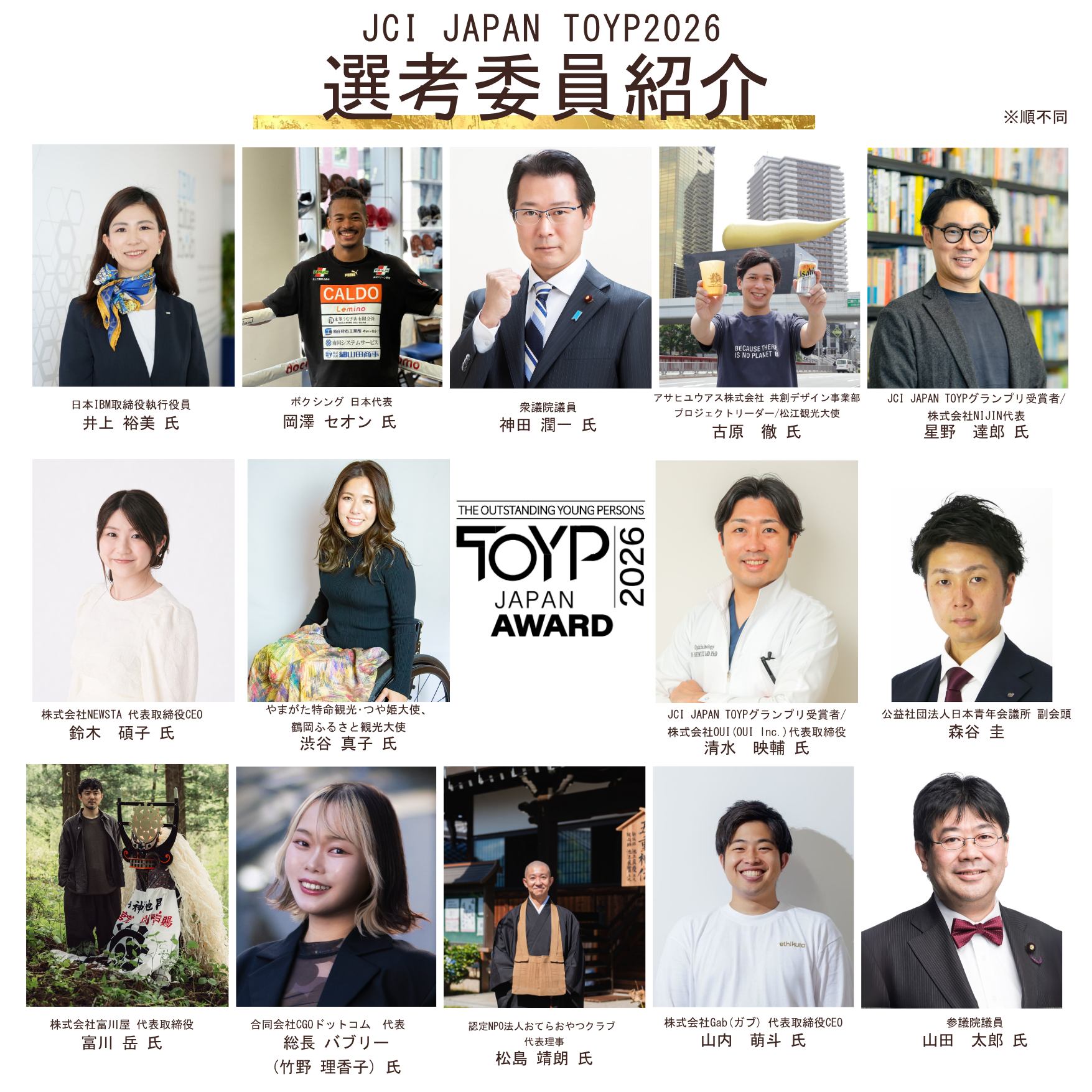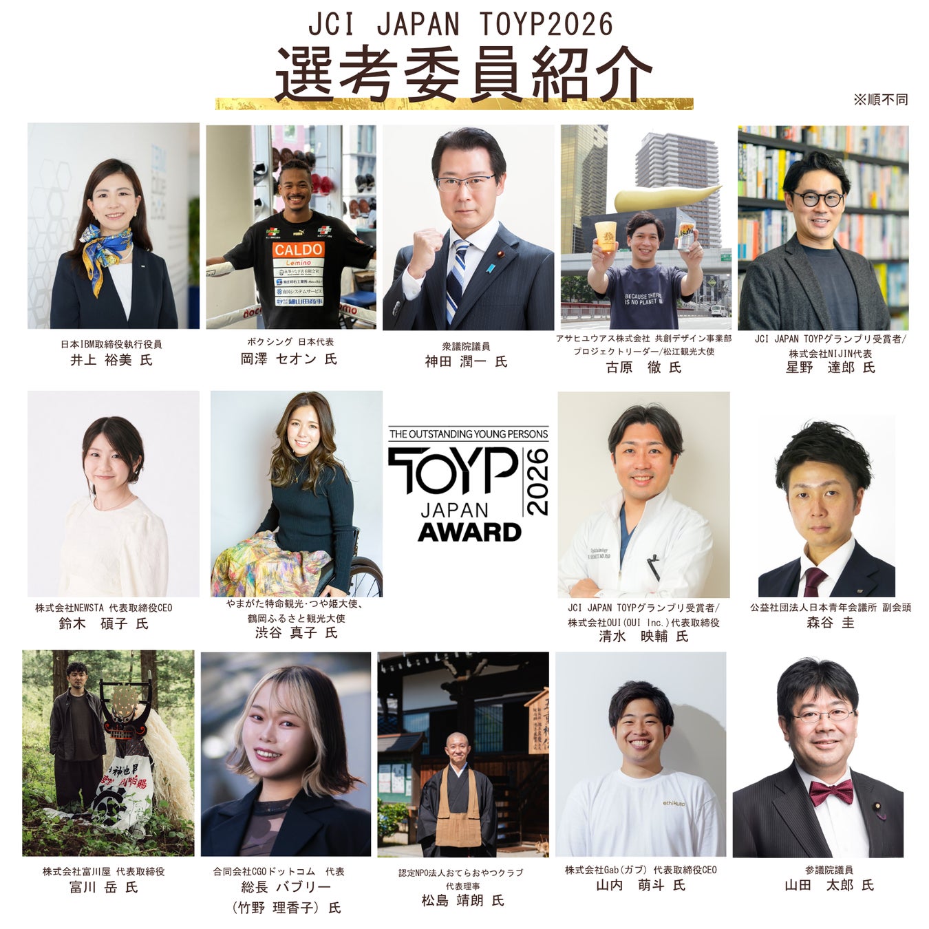 公益社団法人日本青年会議所(会頭:加藤大将、所在地:東京都千代⽥区麹町2-12-1VORT半蔵⾨7F、以下「日本JC」)が主催する「JCI JAPAN TOYP 2026」(第40回青年版国民栄誉賞)の最終選考委員14名が決定しましたのでお知らせいたします。