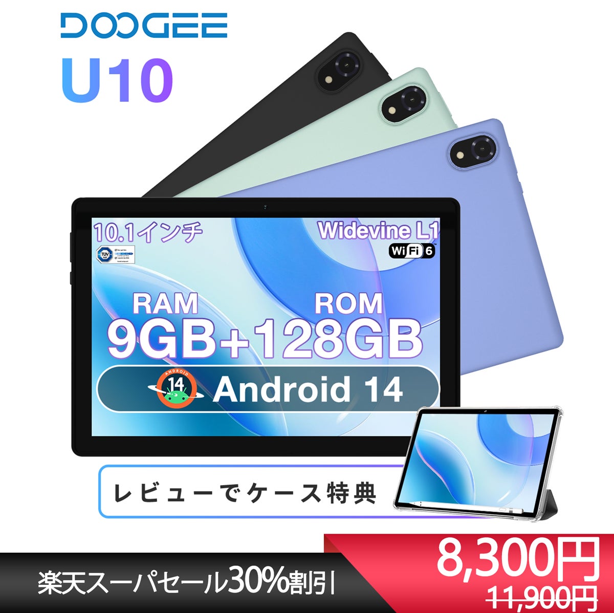 特長:Android14 WIFI6 タブレット RAM 9GB&128GB ROM+最大1TB拡張 8コア 2.0GHz プロセッサー 10.1インチタブレット WIFIモデル Widevine L1対応 TÜV認証 デュアルスピーカー 軽量 格安タブレット DOOGEE U10 タブレット本体
