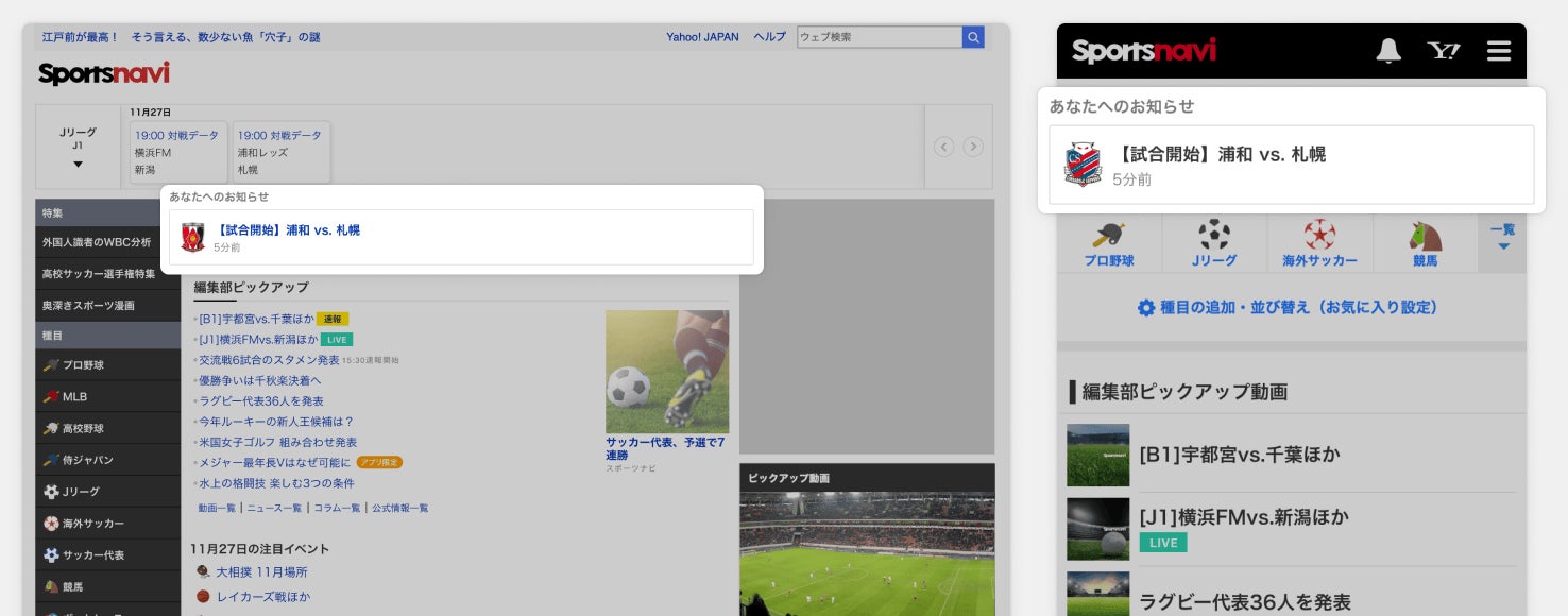 応援しているチームを登録できる「フォロー機能」は、すでに高校の野球部とプロ野球の12球団、一部の大学の野球部を対象に提供しており(※1)、多くのユーザーから、試合情報を見逃すことがなくなったと好評を得ています。そして今回、「フォロー機能」の対象に、Jリーグの全チームと海外サッカー1部リーグのチーム(※2)を追加し、フォローしたチームの試合情報などを「スポーツナビ」アプリのプッシュ通知で受け取れるほか、ブラウザー版「スポーツナビ」のトップページと、「スポーツナビ」内のJリーグ、海外サッカーのトップページにも、フォローしたチームの試合情報などが表示されるようになります。