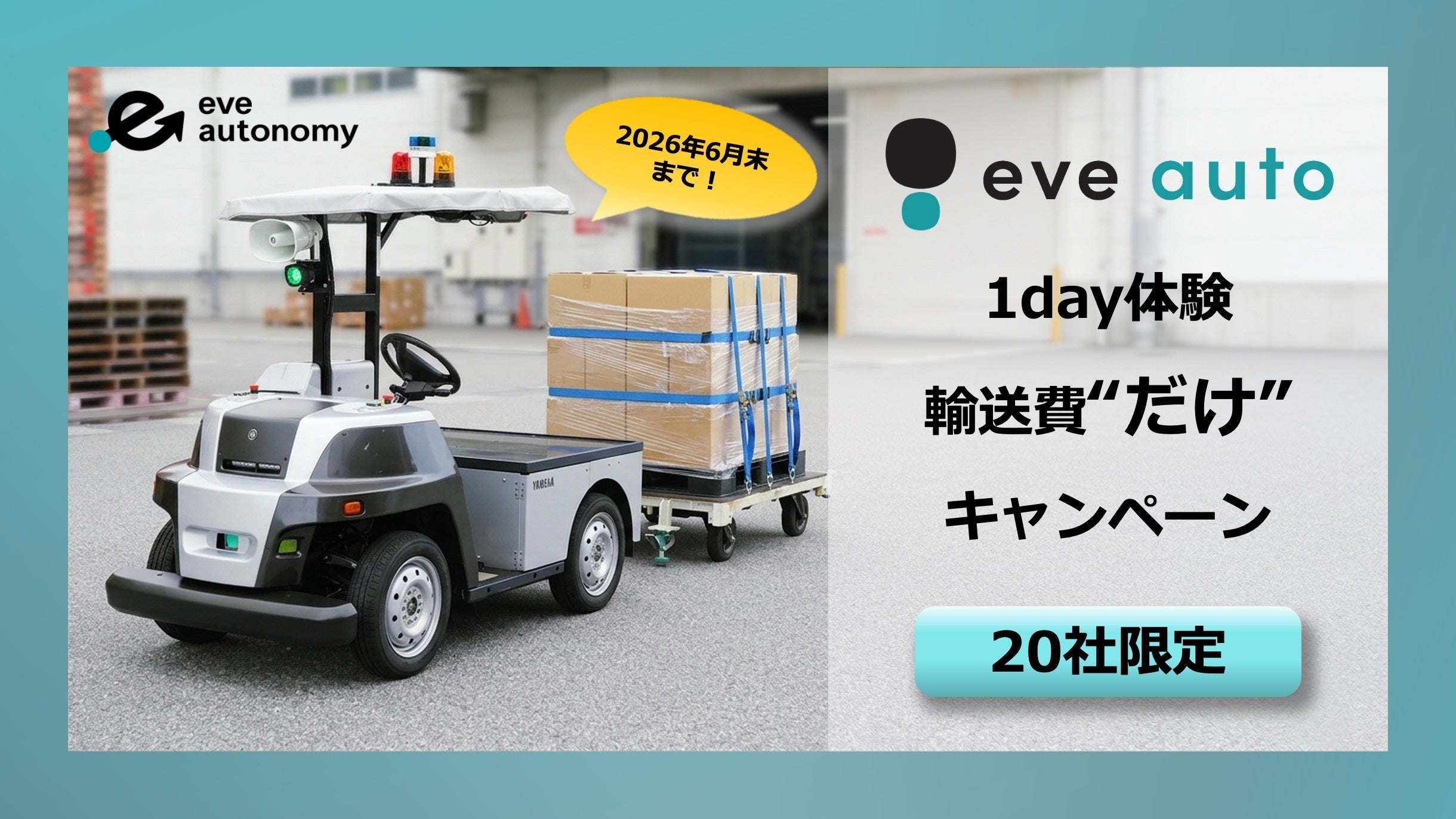 株式会社eve autonomy(イヴ・オートノミー、本社:静岡県磐田市、代表取締役CEO:星野亮介、以下「eve autonomy」)は、より多くのお客様に実現場での自動走行をご体験いただくことを目的に、輸送費のみのご負担で導入前検証が可能となる「eve auto 1day体験 輸送費“だけ”キャンペーン」を、20社限定・期間限定で開始いたします。