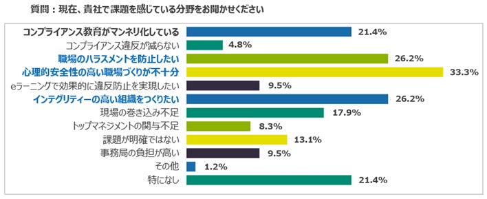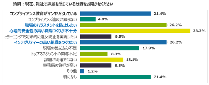 ②課題を感じている分野:インテグリティーと心理的安全性を高め、ハラスメントを防止したい