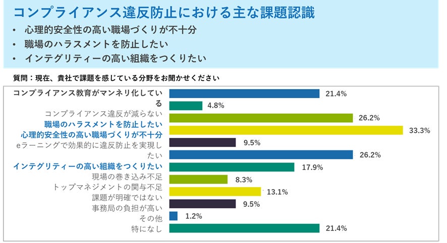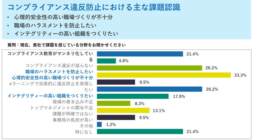 職場のハラスメント防止や本質的なコンプライアンス違反防止のために、知識やルールなどのハード面のみならず、職場の心理的安全性を高めることや、組織のインテグリティー向上に関するソフト面への課題認識の高まりが見られます。