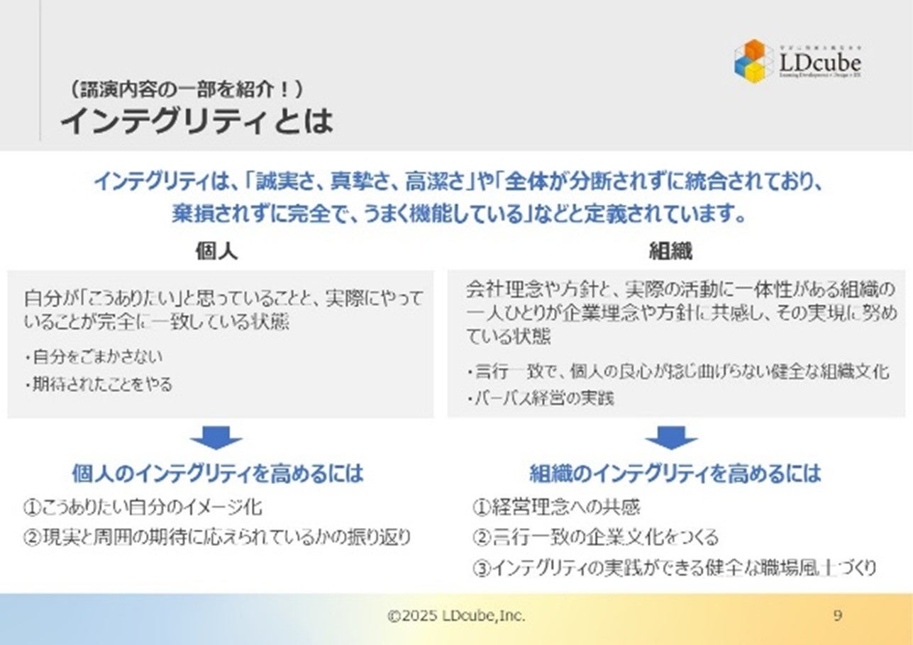 本講演では、インテグリティーの意味合いや重要性をご紹介しながら、ポイントとなる心理的安全性を高める方法についてもご案内します。